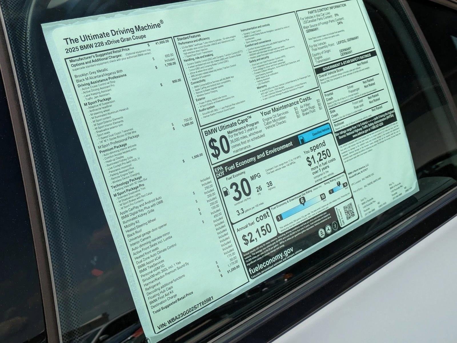 This 2025 BMW 2 Series 228 xDrive is offered to you for sale by BMW of Rockville. This BMW includes: WHEELS: 18 Aluminum Wheels BLACK ROOF TECHNOLOGY PACKAGE Navigation System Automatic Parking Back-Up Camera Aerial View Display System Heads-Up Display EXTENDED SHADOWLINE TRIM REMOTE ENGINE START Remote Engine Start M SPORT PACKAGE Transmission w/Dual Shift Mode Leather Steering Wheel 7-Speed A/T A/T HEATED STEERING WHEEL Heated Steering Wheel DRIVING ASSISTANCE PROFESSIONAL PACKAGE Cruise Control Steering Assist Adaptive Cruise Control BLACK W/STITCHING Vinyl Seats Cloth Seats Leather Seats Premium Synthetic Seats M SPORT PROFESSIONAL PACKAGE Rear Spoiler ILLUMINATED KIDNEY GRILLE INTERIOR CAMERA BROOKLYN GREY METALLIC UNIVERSAL GARAGE-DOOR OPENER Universal Garage Door Opener TRANSMISSION: 7-SPEED DUAL CLUTCH W/SHIFT PADDLES Transmission w/Dual Shift Mode 7-Speed A/T A/T *Note - For third party subscriptions or services, please contact the dealer for more information.* Outstanding craftsmanship and artisanal refinements abound with this BMW 2 Series 228 xDrive. This vehicle was engineered to be both economically and environmentally friendly with exceptional fuel efficiency. When driving an all wheel drive vehicle, such as this BMW 2 Series 228 xDrive, superior acceleration, traction, and control come standard. Where do you need to go today? Just punch it into the on-board navigation system and hit the road. Added comfort with contemporary style is the leather interior to heighten the quality and craftsmanship for the BMW 2 Series 228 xDrive.